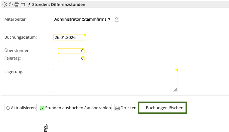 Mit den notwendigen Rechten haben Sie die Möglichkeit, die ausgebuchten Stunden über die Funktion „Buchung löschen“ wiederherzustellen.